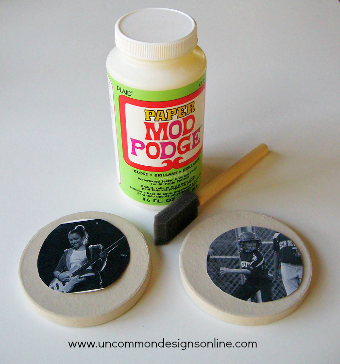 Next you will cut out your photo in a circle. I used the center of my sticker as the pattern to know how large to cut the circles. Adhere the photos to the painted disc with Mod Podge. I had paper Mod Podge on hand, so that is what I used. Applying photos can be tricky because they can easily smear if not printed off with a laserjet printer. I only put Mod Podge on the backs of my photos due to printing on cardstock at home. Mod Podge Rocks has LOTS of great tips on using Mod Podge with photos. Go check out Amy’s site {Mod Podge Rocks} for her helpful tips and tricks!