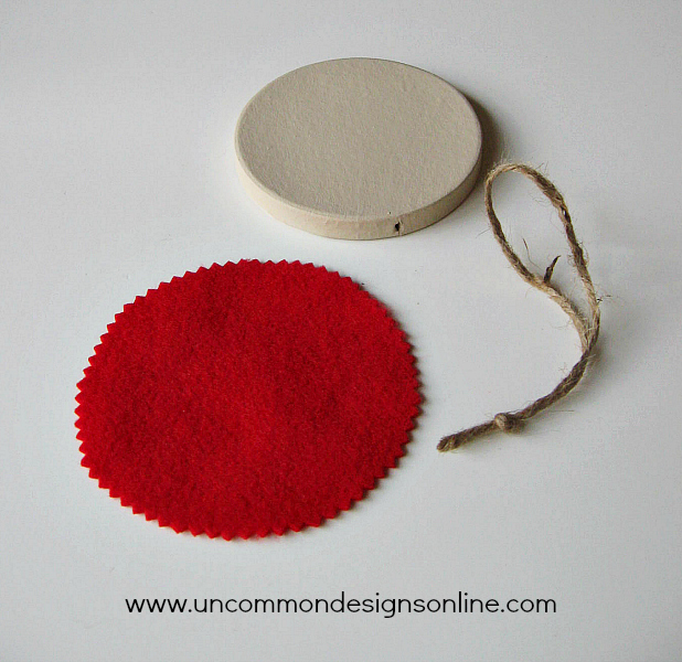 Cut a circle out of the felt with pinking shears, making sure it is a little larger in diameter than the paper mache disc. Tie a loop out of the twine and insert it back into the top of the paper mache disc. I made the hole a little larger and used a pointed screwdriver to “push” the twine hanger into the hole. I then added a little bit of glue from my glue gun to secure it.