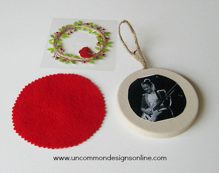 Finally, place the holly wreath sticker on top of the photo. Attach the felt to the back of the paper mache disc with a little glue from the glue gun.